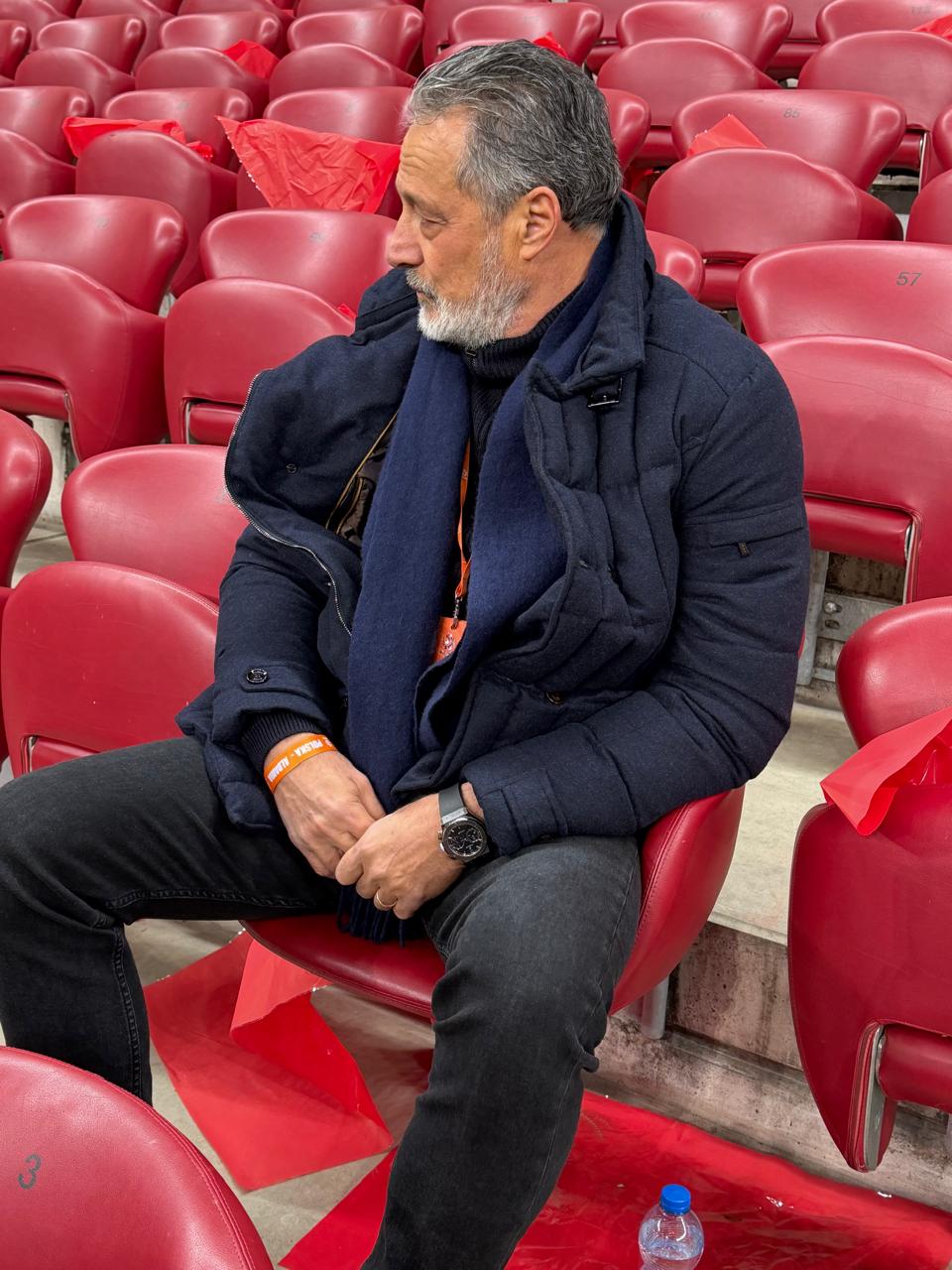 Ai rrinte i ulur në atë karrige të kuqe sikur të ishte pjesë e saj. Unë dhe Foto Strakosha po shikonim lojën së bashku dhe po flisnim për lojën. Ai fliste jo si spektator, por si një njeri që kishte vendosur të mos lëvizte, sepse çdo lëvizje mund ta prishte diçka të padukshme që mbahej pezull në fushë.